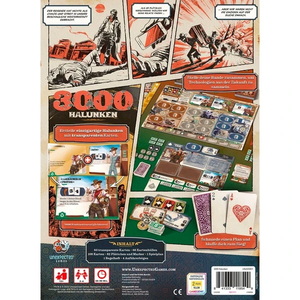 Das Strategiespiel 3000 Halunken verbindet auf äußerst unterhaltsame die Themen Wilder Westen und Science Fiction. Dabei führt jeder der 2-4 Spieler eine Bande von Halunken an, die die zurückgelassenen Technologien eines mysteriösen Reisenden sammelt. Doch sie müssen schnell sein, dann bald werden die Regierungsvertreter hier sein und alles einsammeln! Um das Spiel zu gewinnen, werden Halunken angeheuert und deren einzigartige Fähigkeiten genutzt. Jeder Halunke setzt sich aus drei Teilen zusammen: Einer transparenten Jobkarte, einer Eigenschaftskarte und einer Kartenhülle. Es gibt 3000 verschiedene Kombinationsmöglichkeiten für die Halunken, wodurch jede Partie einzigartig wird. Die wertvollen technologischen Gerätschaften des Reisenden sollen Gerüchten zufolge sicher in Safes verwahrt sein, die im Depot, im Anwesen des Reisenden und in seinem geheimen Labor zu finden sein sollen. Jeder Safe, den ein Spieler stiehlt, ist am Spielende Techpunkte wert. Wer am Ende des Spiels die meisten Techpunkte gesammelt hat, gewinnt und entscheidet über das Schicksal des Wilden Westens!Art.-Nr.: 1902090