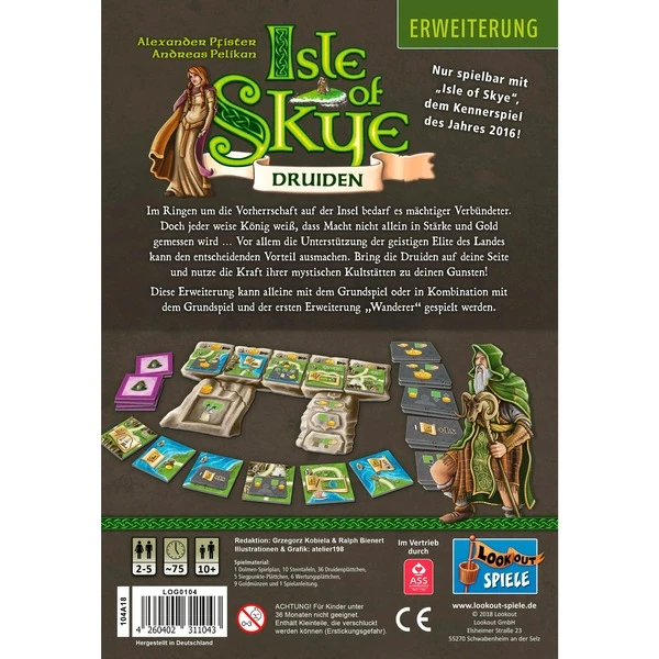 | Inhalt/Ausstattung | Dolmen-Spielplan, 10 Steintafeln, 36 Druidenplättchen, 5 Siegpunkte-Plättchen, 6 Wertungsplättchen, 9 Goldmünzen | ||