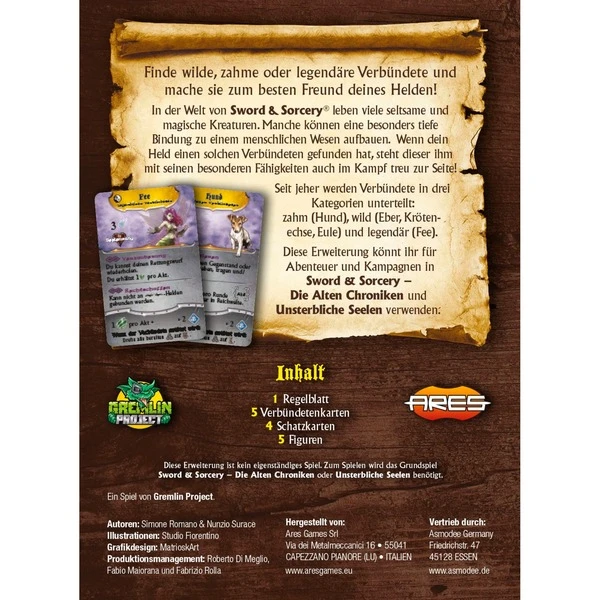 Der Zubehör-Pack Sword & Sorcery – Rechtschaffene Verbündete enthält fünf neue Verbündete für die Helden aus Sword & Sorcecry. Sie werden in drei Kategorien unterteilt: Zahm (Hund), wild (Eber, Krötenechse, Eule) und legendär (Fee). erbündet sich ein Held mit einem dieser Wesen, so steht ihm dieses mit seinen Fähigkeiten im Kampf zur Seite.Art.-Nr.: 1901530