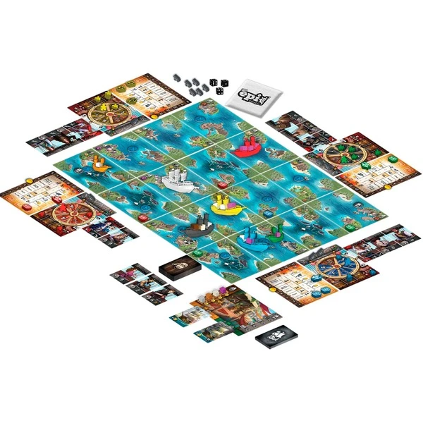 | Inhalt/Ausstattung | 7 Schiffsfiguren, 88 Holzkomponenten, 4 Metalldublonen, 1 Stoffbeute, 3 Würfel, 42 Plättchen, 4 Steuertableaus, 4 Ruftableaus, 16 Meereskarten, 1 Markttableau, 28 Crew- und Captainkarten, 11 Handelsschiffkarten, Anleitung | ||