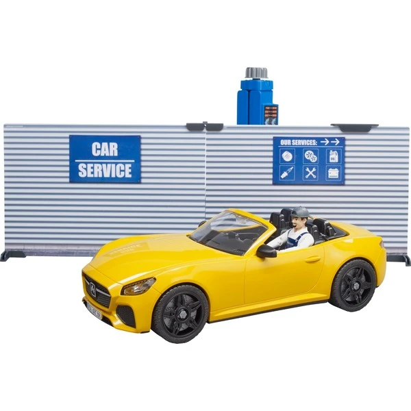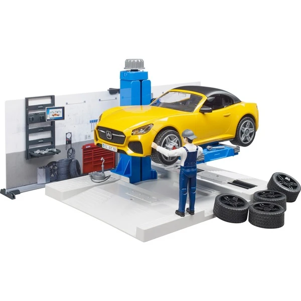| Inhalt/Ausstattung | Höhenverstellbare Hebebühne mit Bremsentest, kompletter Satz Wechselräder, Mechaniker mit Werkzeug und Luftdruckmesser, Wandregal mit Ablagen und Halterungen, beidseitig bedruckte Hintergrundelemente mit Stellfüßen, bruder Roadster mit abnehmbaren Dach und Rädern. | ||