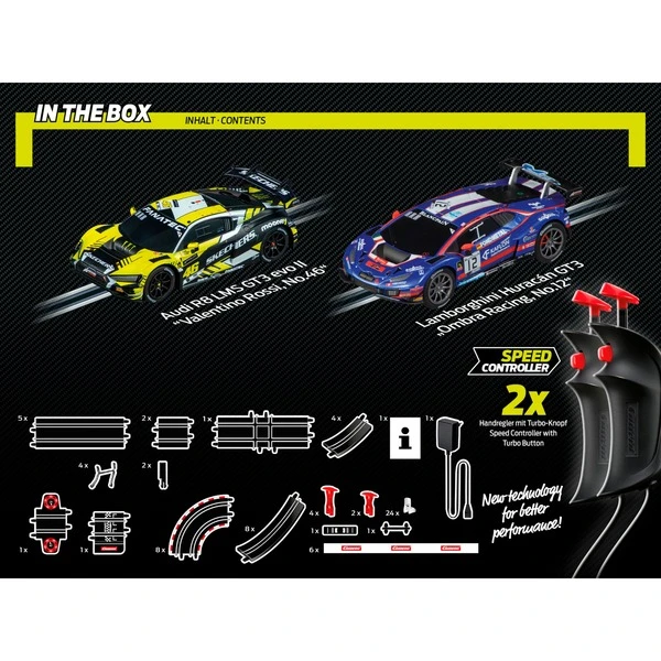 6,3 Meter Streckenlänge und zwei schicke GT-Rennwagen: Das ist das Rennbahn-Set „GT Super Challenge“ aus der Carrera-Serie GO!!!. Mit den enthaltenen zwei Handreglern tritt der Rennwagen Audi R8 LMS GT3 evo II, gefahren vom neunfachen Motorrad-Weltmeister Valentino Rossi, gegen den Lamborghini Huracán GT3 „No. 8″ an. Kreuzung, Fly-Over und ein nervenaufreibender Looping sorgen für einzigartigen Rennspaß.