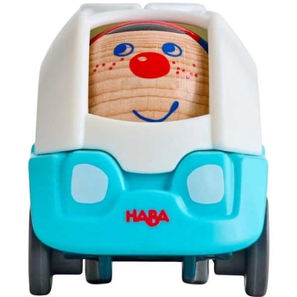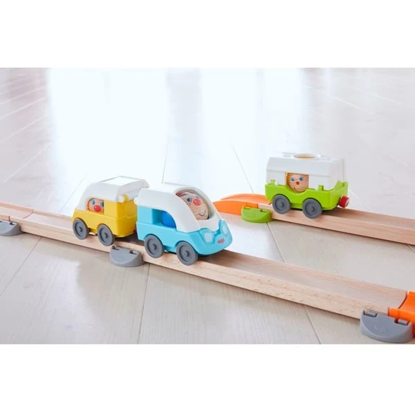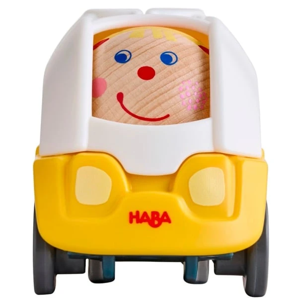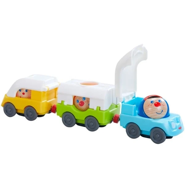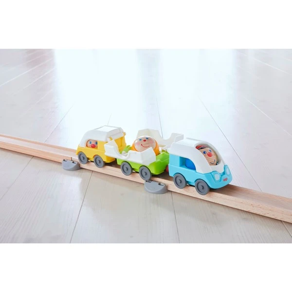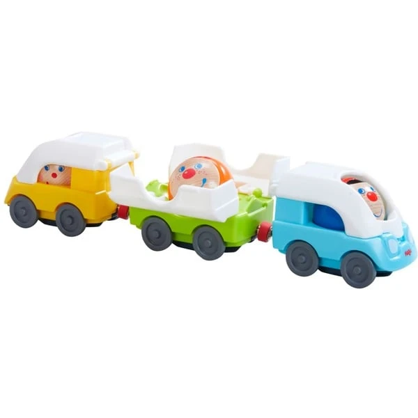 Der Kullerbü-Schnellzug fährt über die Schienen der HABA Spielbahnen. In den drei Wagen sitzen je eine Charakterkugel und gucken aus den Fenstern. Die Passagiere Peter, Pia und Patrik lieben das Zugfahren. Fürs Ein- und Aussteigen lassen sich die Dächer der Wagen ganz einfach aufklappen. Mit Magneten halten die Waggons aneinander. Ein kleiner Ruck genügt und der Zug kann mit anderen Kullerbü-Fahrzeugen mit Magnetkupplung kombiniert werden.