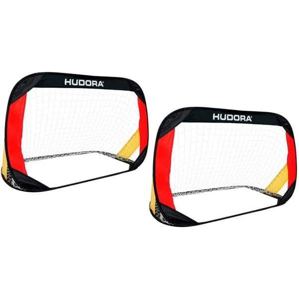Das Pop Up Fußballtor 2er Set ist dank der cleveren, integrierten Pop Up-Funktion sekundenschnell aufgebaut und spielbereit. Egal, wo die Reise hingeht, in den Garten oder in den Park, die zwei Fußballtore sind sportliche Spaßgaranten zum Mitnehmen. In der praktischen Tragetasche können sie leicht platzsparend verstaut und transportiert werden. Die mitgelieferten Heringe sorgen für festen Stand der Tore auf weichem Untergrund und das dreilagige Polyesternetz hält jeden Ball, der nicht vom Torhüter gehalten wird. Das Design der Fußballtore in Deutschlandfarben mit sportlichen Ball-Prints trifft die Herzen kleiner Nationalmannschaft-Fans. Die Maße des Tores liegen bei 120 x 80 x 80 Zentimetern. Art.-Nr.: 1903128