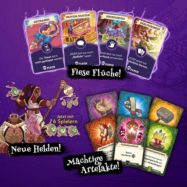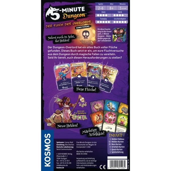 In dieser Erweiterung für 5-Minute Dungeon hat der Overlord mächtig aufgerüstet. Jeder Endgegner hat neue Spielzeuge erhalten mit denen sie den Helden das Leben schwer machen, allen voran die neuen Fluchkarten, die die Helden vor dauerhafte Probleme stellen. Doch auch die Helden haben neue Tricks im Ärmel: mächtige Artefaktkarten unterstützen die Heldengruppe, die dank neuer Verbündeter nun auch zu sechst den Dungeon erobern können. Ein spannendes Realtime-Abenteuer wartet!Art.-Nr.: 1524805