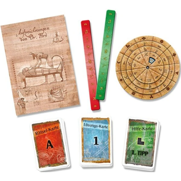 | Inhalt/Ausstattung | 1 Buch, 1 Decodier-Scheibe, 23 Rätsel-Karten, 30 Lösungs-Karten, 33 Hilfe-Karten, 2 seltsame Teile, 1 Spielanleitung | ||