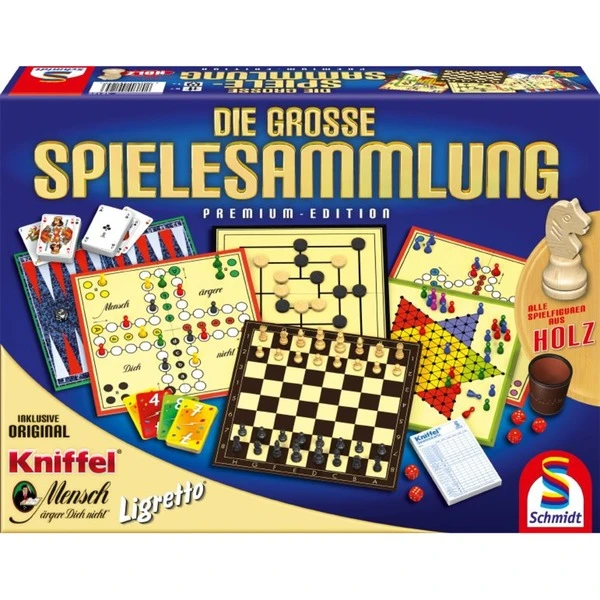 Diese Premium-Edition mit über 100 raffinierten Spielemöglichkeiten enthält neben den original MENSCH ÄRGERE DICH NICHT und KNIFFEL das beliebte LIGRETTO-Kartenspiel und viele weitere populäre Spiele wie Backgammon und Halma. Hochwertiges Material wie Spielfiguren aus Holz und ein lederartiger Würfelbecher inklusive!Art.-Nr.: 1186695