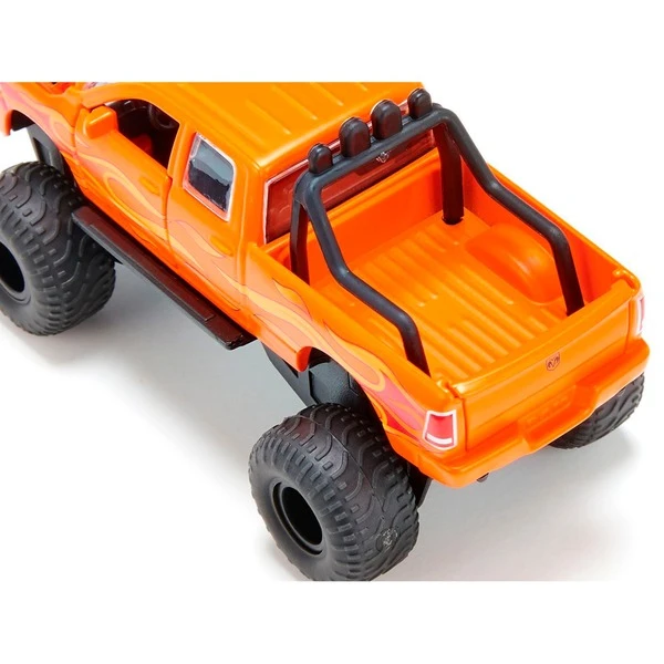Diese Version des RAM 1500 kommt mit auffälliger oranger Lackierung und Flammendekor an der Seite, aber vor allem mit riesigen, abnehmbaren Ballonreifen. Das Modellfahrzeug verfügt über eine Federung und eine Anhängerkupplung. Die Türen und die Motorhaube dieses zugkräftigen Pick-Ups lassen sich ebenso wie die Heckklappe öffnen.Art.-Nr.: 1902871