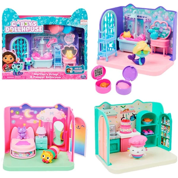 Mit Spin Master können Vorschulkinder in die katztastische Welt der beliebten Animationsserie Gabby’s Dollhouse eintauchen. Mit den detailgetreuen Deluxe-Räumen können die Abenteuer der Serie authentisch nachgespielt werden. Jeder Deluxe-Raum kommt mit einer der beliebten Katzenfiguren und steckt voller liebevoller Details und Überraschungen, die es zu entdecken gilt. Neben einer Katzenfigur, den Möbeln und liebevollen Einrichtungs-Accessoires kommt jeder Raum mit zwei Cat Deliveries-Überraschungsboxen. Genau wie Gabby zu Beginn jeder Folge können die Lieferpäckchen geöffnet werden, um die geheimnisvollen Zubehörteile des jeweiligen Sets zu entdecken. Alle Deluxe-Räume sind etwa 15 cm breit und 12 cm hoch und mit Gabby’s Purrfect Puppenhaus (separat erhältlich) kompatibel: Sie können einfach an der Seite des Puppenhauses eingeschoben werden. Es gibt als Zufalls-Varianten das Badezimmer mit MerCat-Figur, das Schlafzimmer mit Pillow-Kuschelkatzenfigur und die Bäckerei mit Kuchi-Figur zu entdecken.Art.-Nr.: 1903341